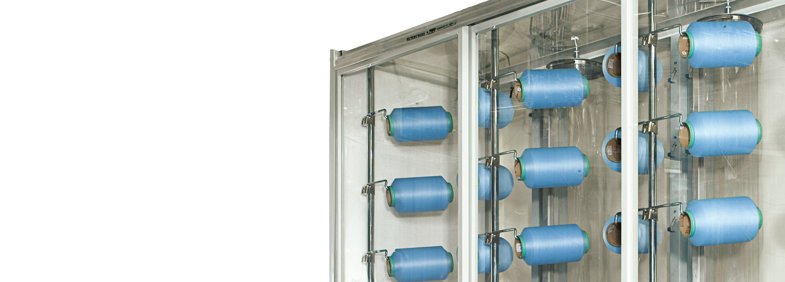 FILTERCREEL 封闭式过滤纱架系统是能确保您无风绵喂纱最可靠的决择,使用封闭式过滤纱架系统可增进织机产能和降低织造疵点。气流吹絮系统清洁了筒纱顶部、前缘和预备纱筒及其头尾相连处,并将飘浮的飞絮和绒毛有效地吸到箱底平面的滤网上。